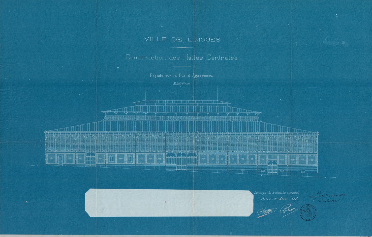 Ce plan représentant la façade des Halles Centrales (cliquer sur l'image pour l'agrandir) a pour particularité d’être réalisé selon le procédé de la cyanotypie.